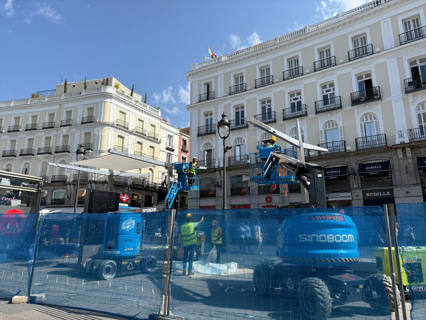 La Puerta del Sol contará por primera vez en su historia con zonas de sombra gracias a la instalación de toldos que estarán plenamente operativos a finales de la próxima semana. Así lo ha confirmado la delegada de Obras y Equipamientos del Ayuntamiento de Madrid, Paloma García Romero, quien ha supervisado este miércoles el tramo final de los trabajos acompañada por el concejal del distrito Centro, Carlos Segura.