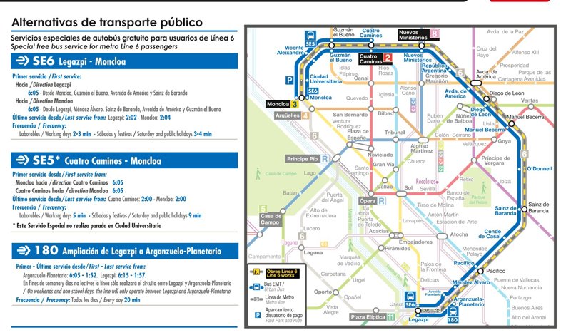- Servicio Especial SE6: Servicio sustitutivo de autobuses entre las cabeceras de Legazpi y Moncloa que contará con 18 paradas que corresponde con las estaciones cerradas por las obras. Dispone de 53 autobuses entre las 6.05 hasta las 2.04 horas y la frecuencia programada oscila entre los 2 y los 3 minutos.