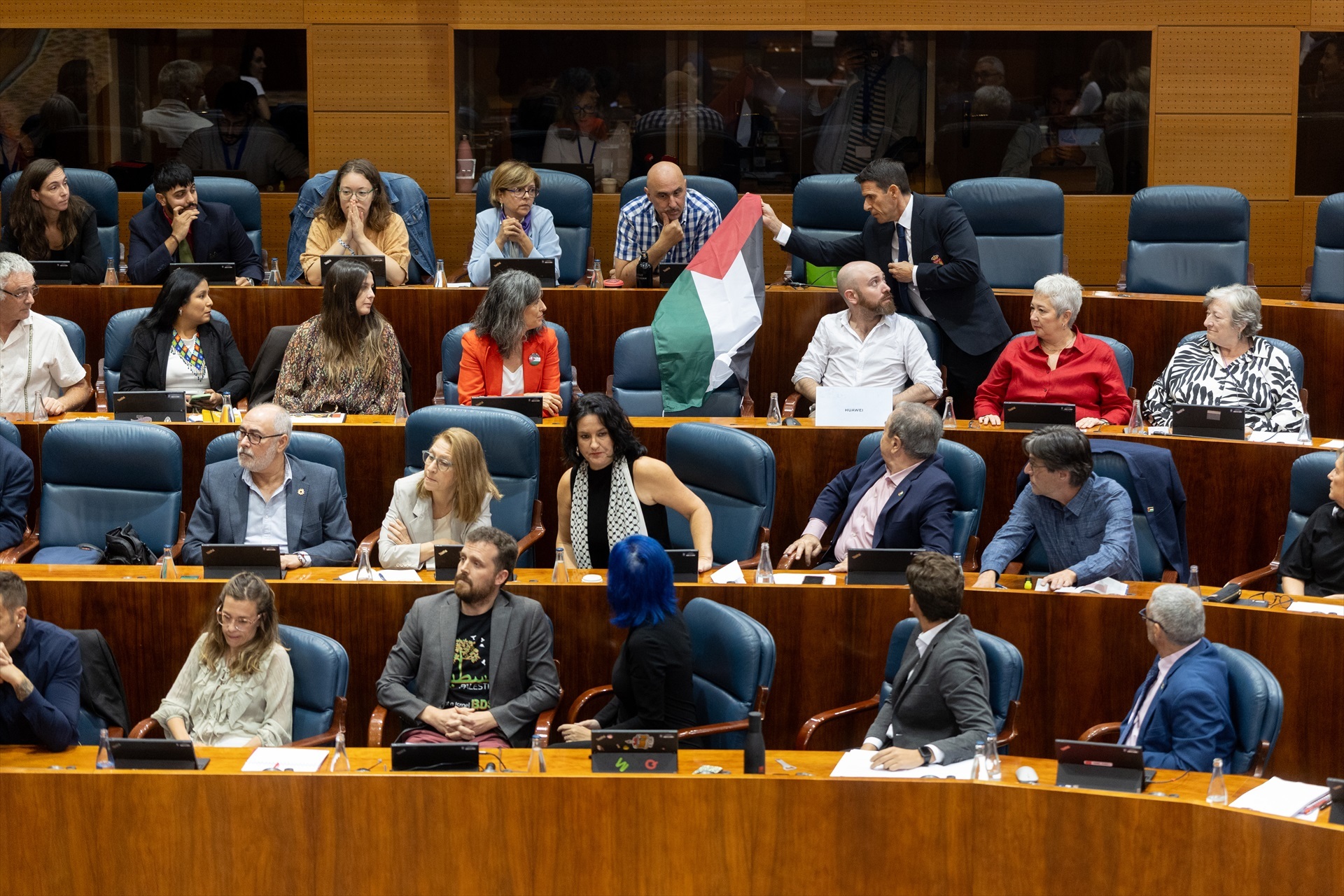 Al término de su intervención, tomó la palabra Bergerot, que apeló al artículo 114.3 del Reglamento. Quiso recriminar que el portavoz del PP les nombrara como "Hamás Madrid". Pero Ossorio no lo permitió. "No tiene la palabra", zanjó. En ese momento, pidió también retirar una bandera palestina que los de Más Madrid habían colocado sobre un escaño. "Que la bajen". "¡No!", gritaron desafiantes varias diputadas de esta formación, por lo que el presidente pidió a los servicios de la Cámara que lo hicieran. Estos se quedaron paralizados durante unos minutos. "¿Por qué no la quitan?, ¿tengo que levantarme yo?", se escuchó a Ossorio. Ante su insistencia, intentaron acceder al escaño pero los diputados de Más Madrid les impedían el paso. Finalmente pudo ser retirada. "Siento haberles puesto en esta situación, pero tenemos un Reglamento", se disculpó después Ossorio.