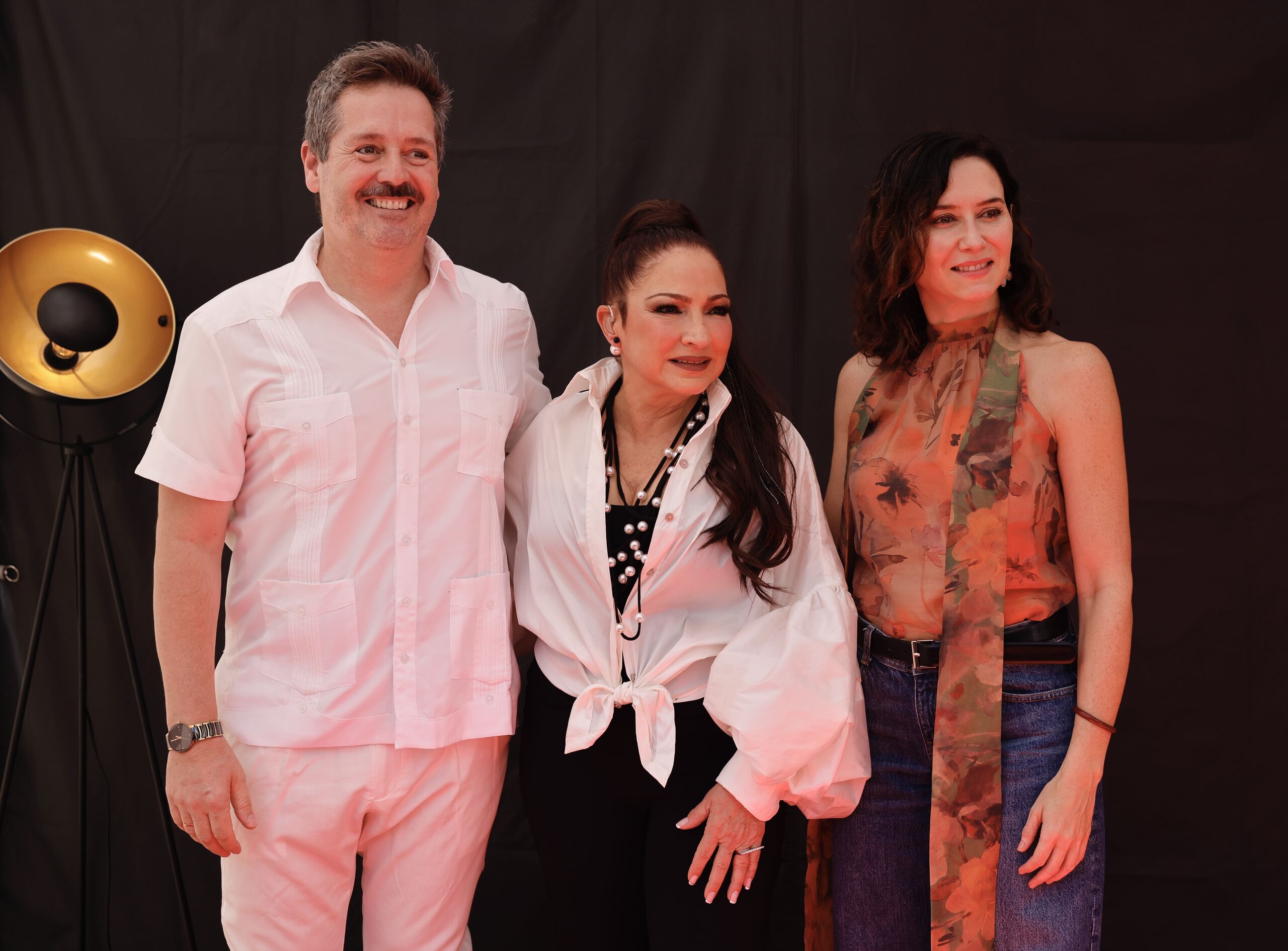 Ayuso junto a Gloria Estefan, a la derecha su marido y productor musical Emilio Estefan