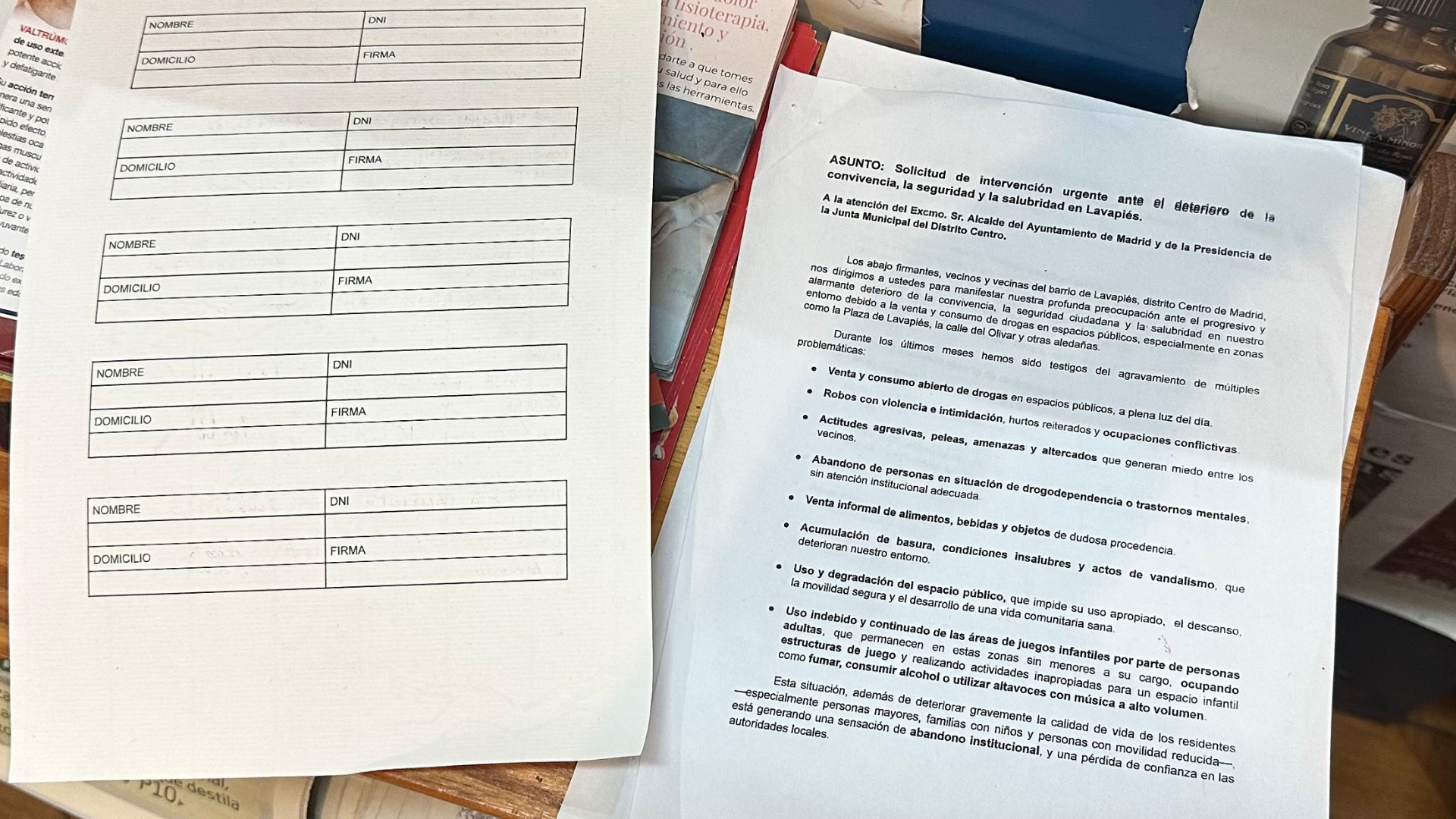 No habla sola. Lo cuentan los vecinos, lo muestran los vídeos que circulan por los grupos de WhatsApp del barrio y lo constata la movilización que se ha extendido por calles como la Fe, del Olivar o Ave María: una recogida de firmas que pide, literalmente, "una intervención urgente ante el deterioro de la convivencia, la seguridad y la salubridad en Lavapiés".