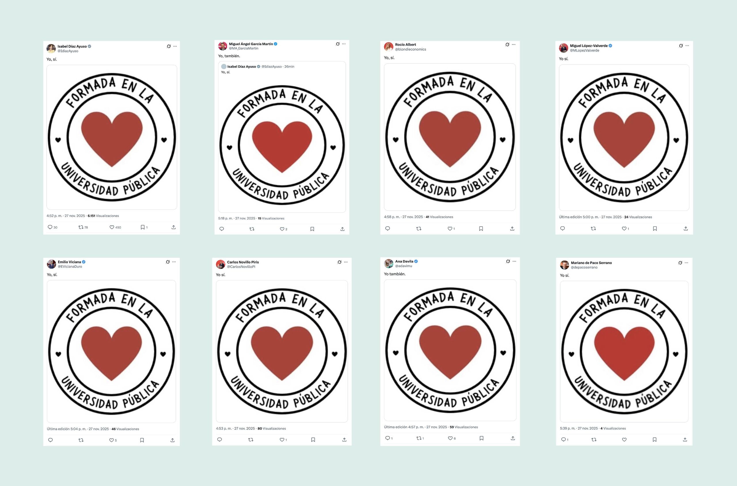 "Formada en la universidad pública", dice el mensaje. A lo que Ayuso añade un "yo, sí", en clara referencia a los estudios en instituciones privadas que cursó el propio Sánchez y otros cargos socialistas.