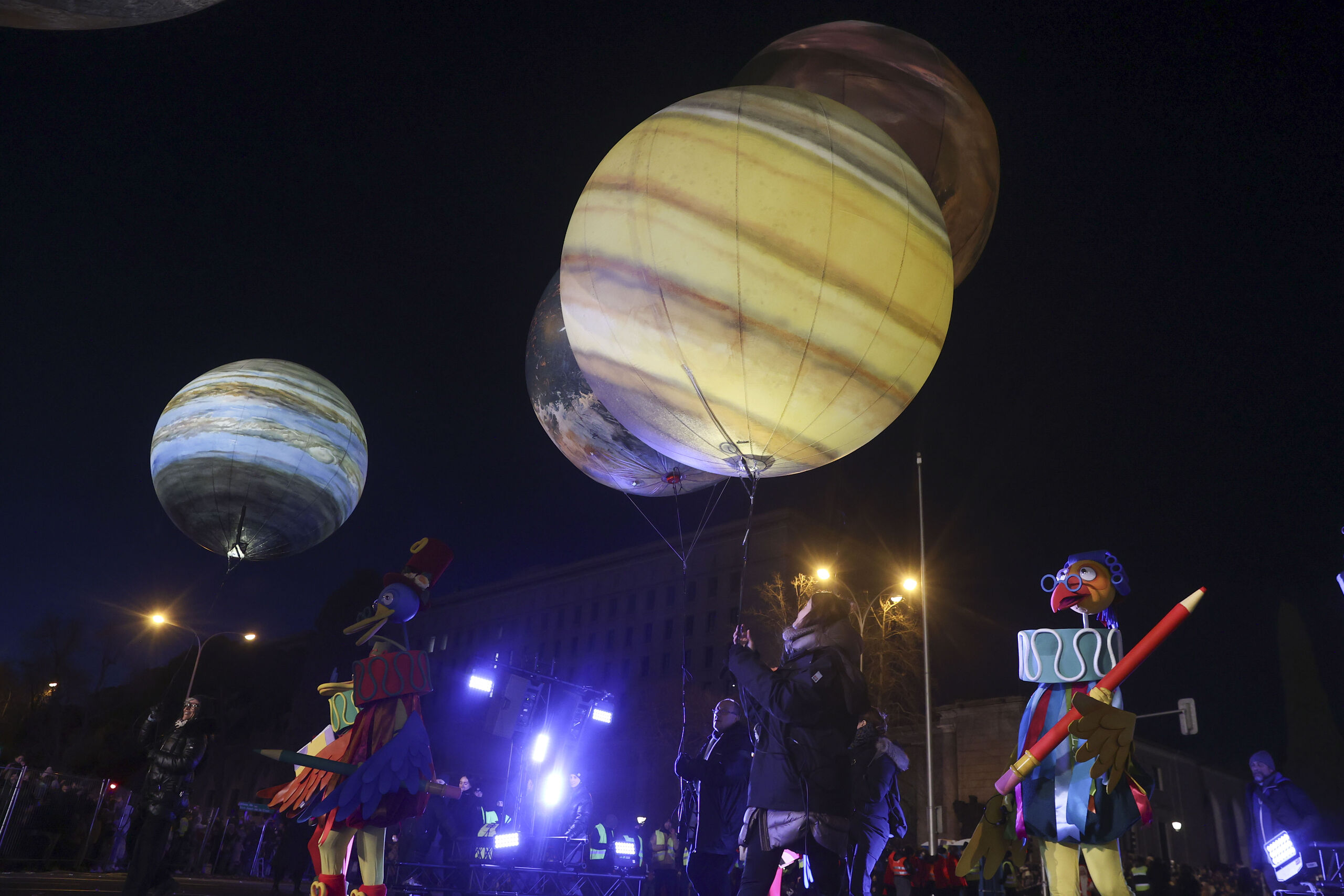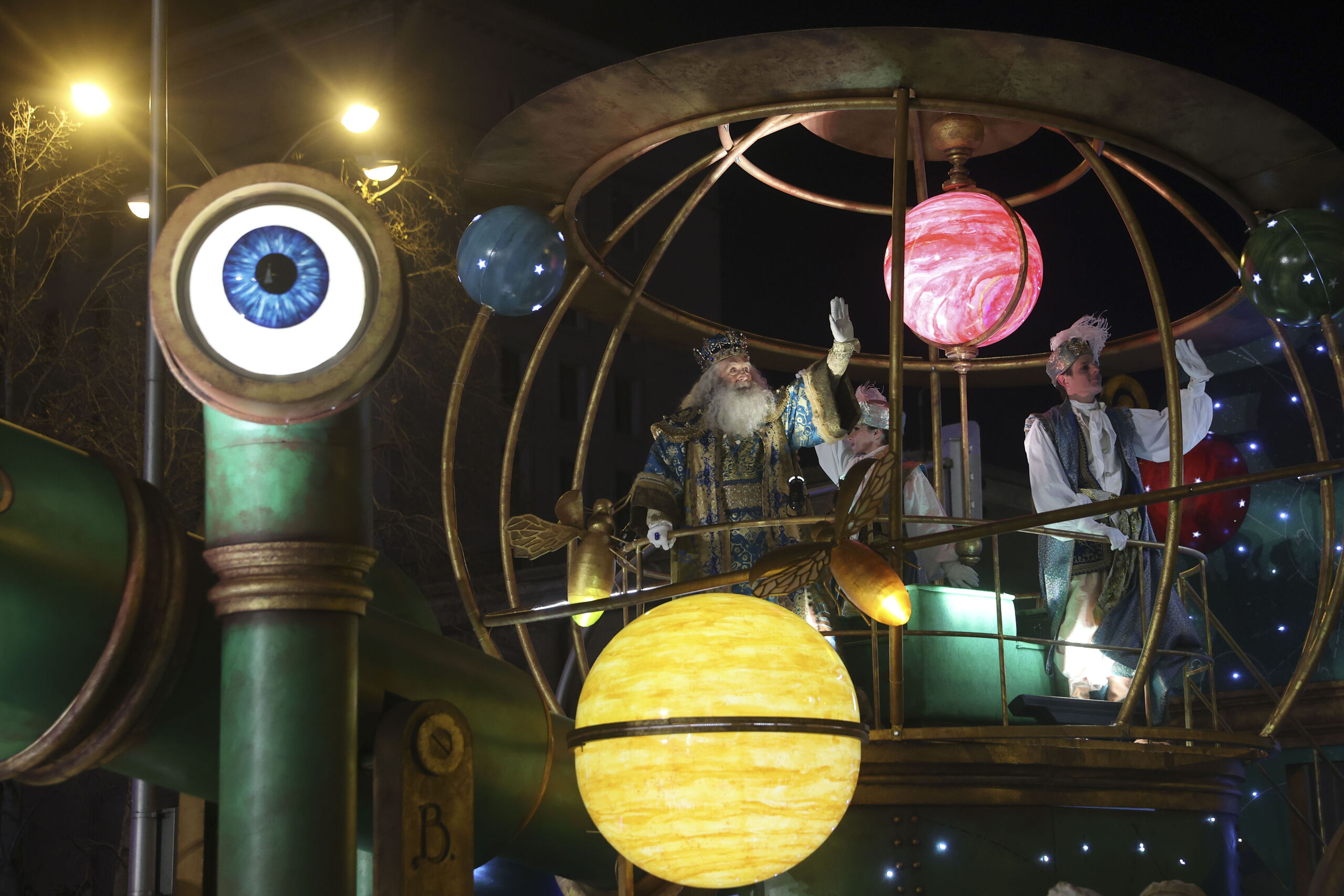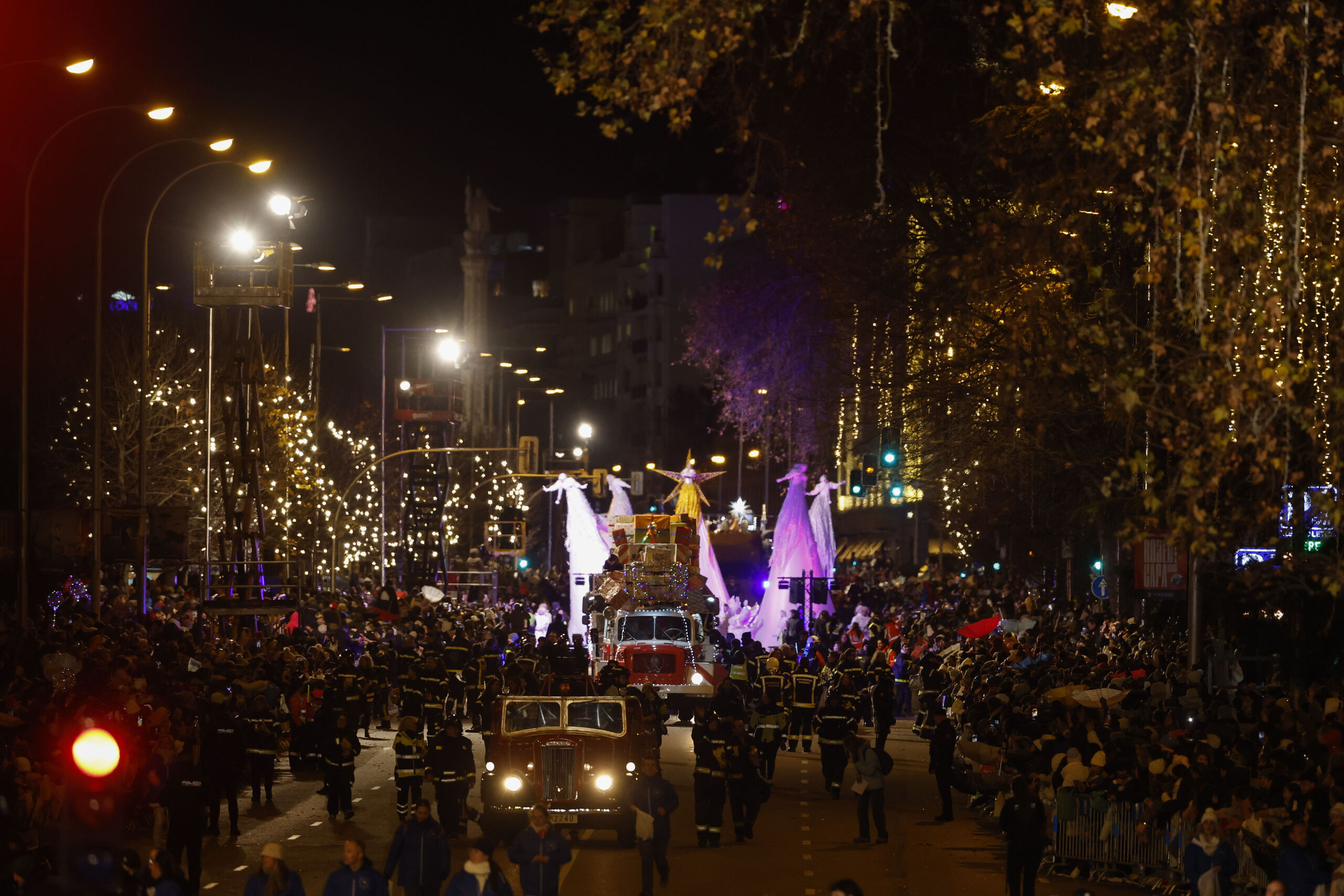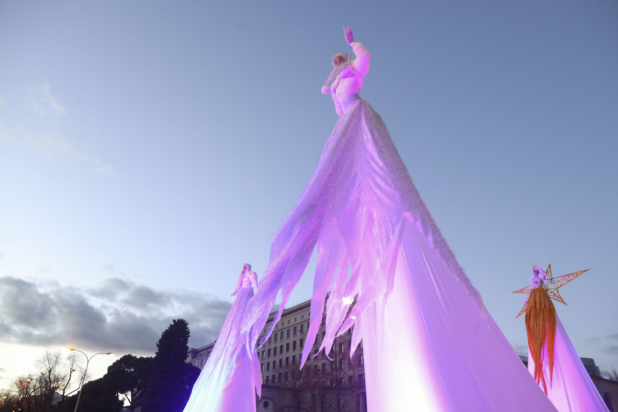 La estrella de Oriente anuncia la llegada de la comitiva de Sus Majestades. Cuatro constelaciones y un cortejo de ángeles custodios acompañan este tramo simbólico del desfile.