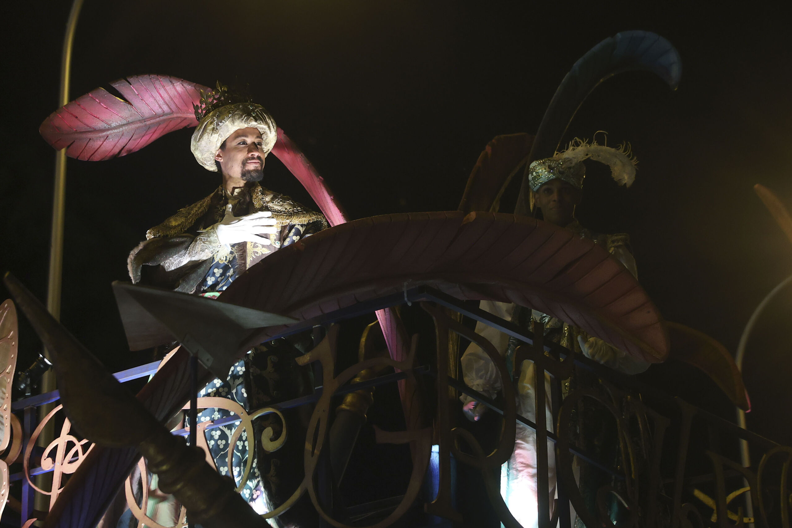 Melchor saluda a niños y familias desde su carroza durante el recorrido del cortejo real.