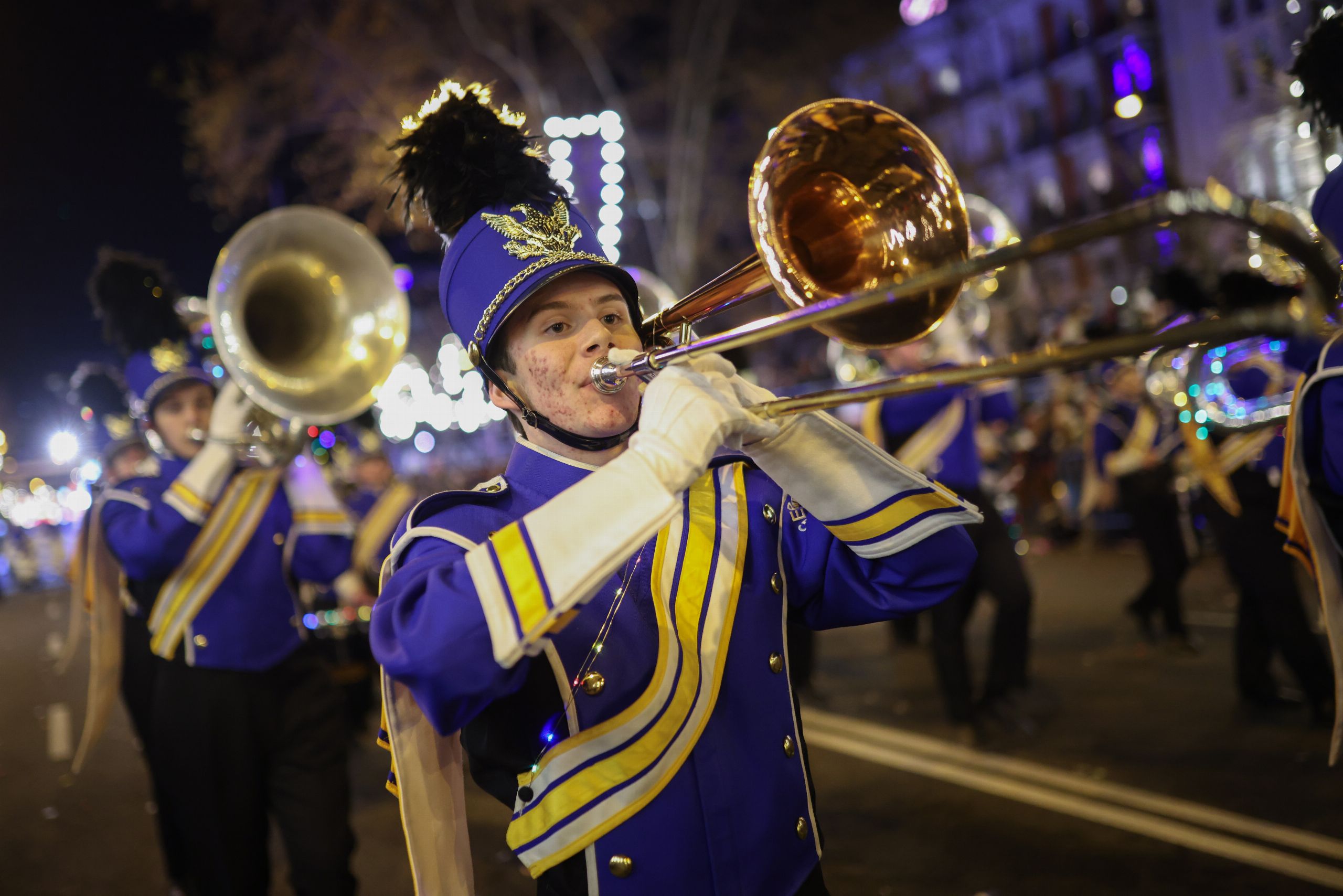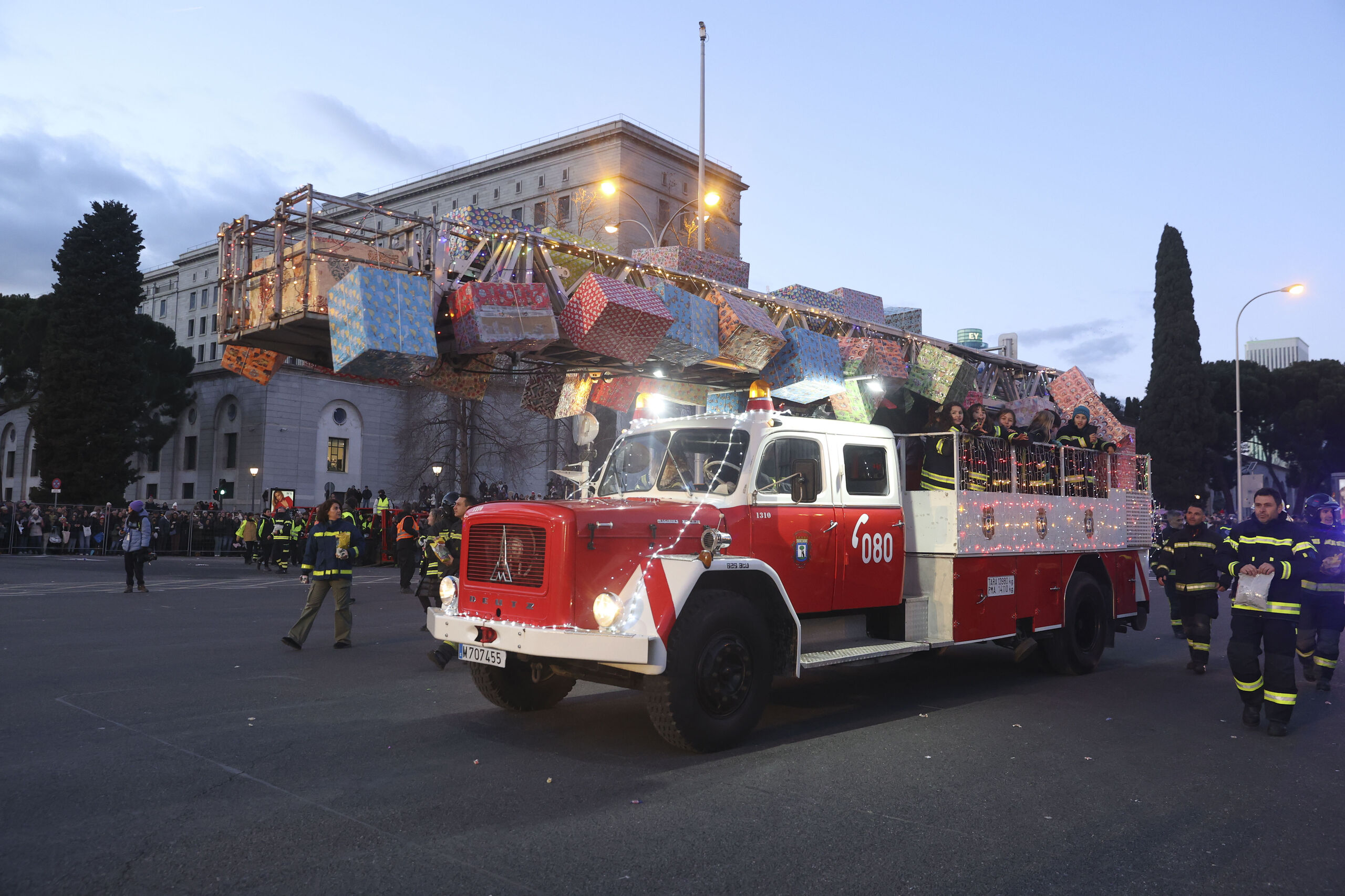 La Policía Municipal de Madrid abre la cabalgata con su Banda de Música y el Escuadrón de Caballería. A continuación, participan autobuses Naviluz y unidades de SAMUR-Protección Civil y SAMUR-Social.