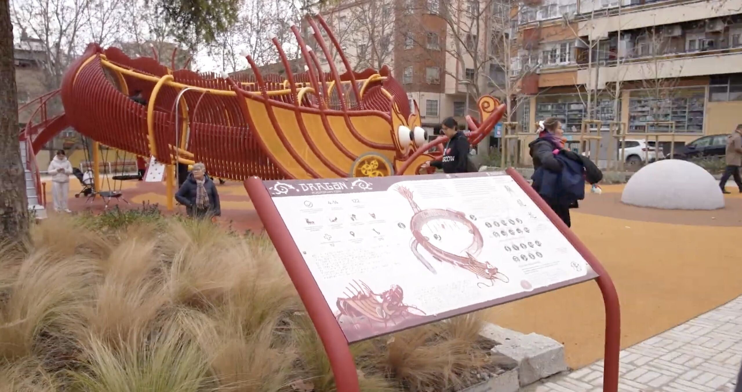 El nuevo parque infantil de la plaza de las Tizas tiene forma de dragón rojo, símbolo de la cultura asiática.