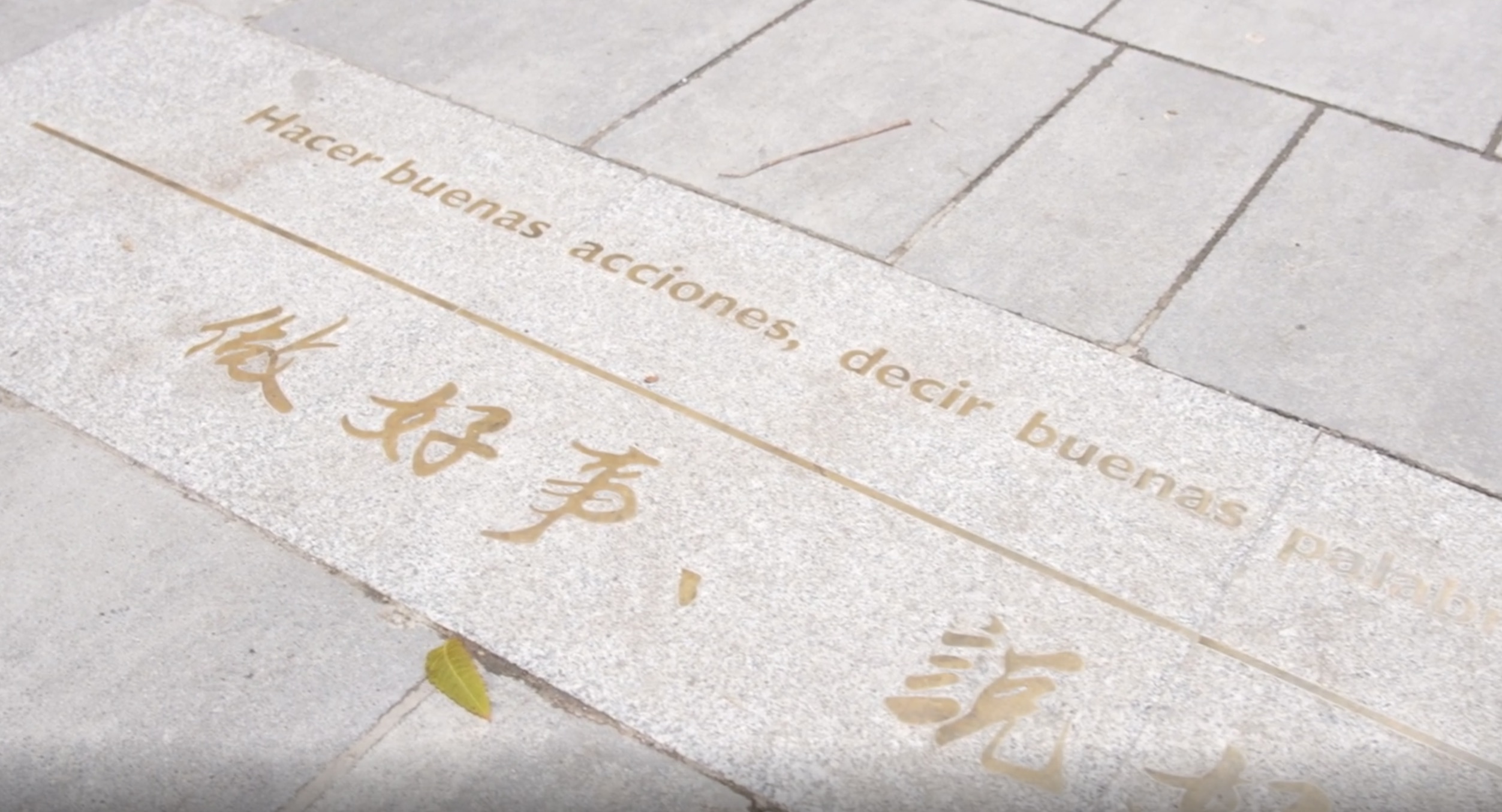 El recorrido integra referencias a la cultura china, como inscripciones y símbolos grabados en el pavimento.