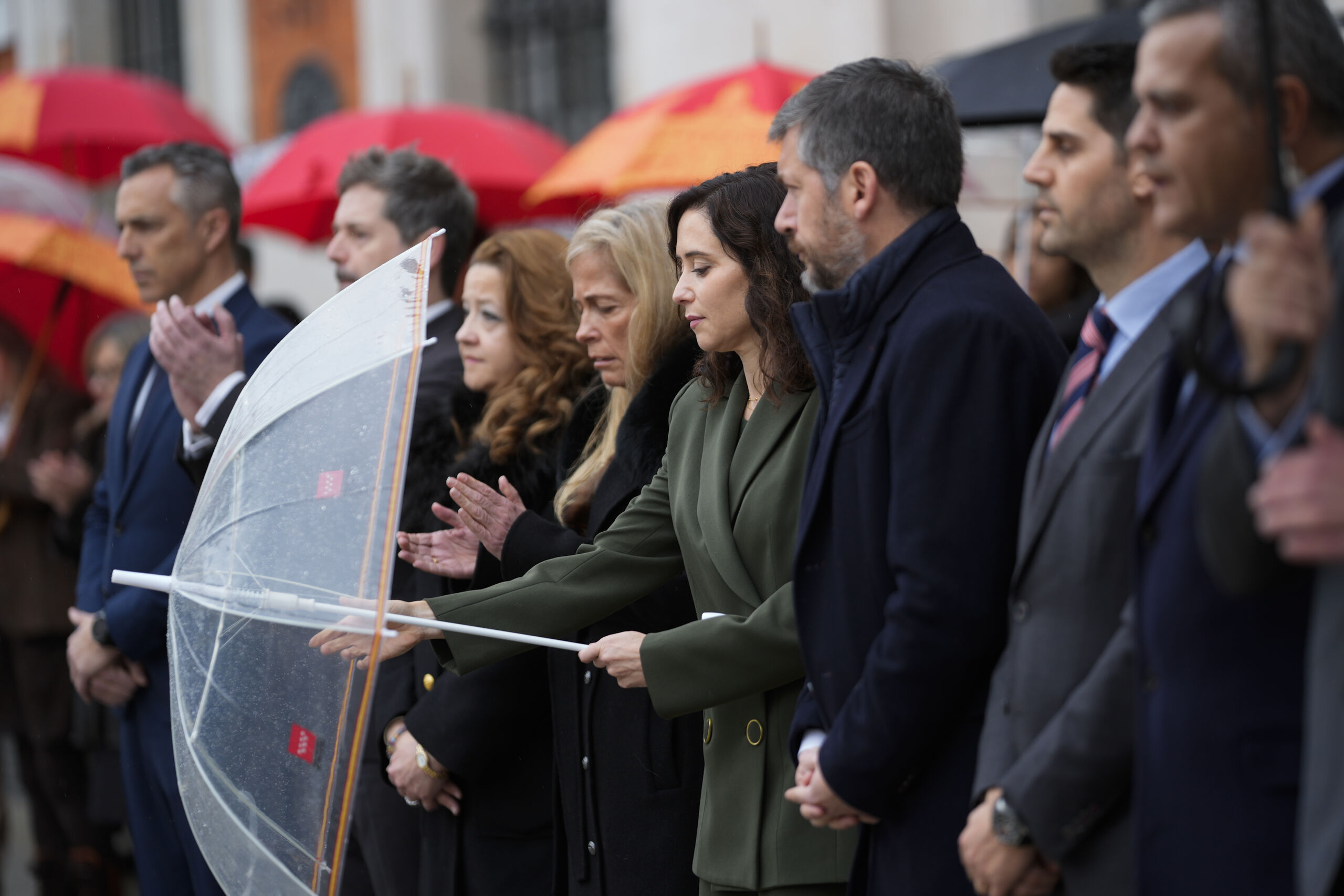 La presidenta madrileña, así como todos sus consejeros, participaron en un minuto de silencio en recuerdo a las víctimas del accidente ferroviario del pasado domingo y por el maquinista fallecido ayer en Gelida (Barcelona). El acto tuvo lugar en la Puerta del Sol, junto a la fachada de la Real Casa de Correos, sede el Gobierno regional, en el segundo de los tres días de luto como señal de duelo decretados por la jefa del Ejecutivo autonómico.