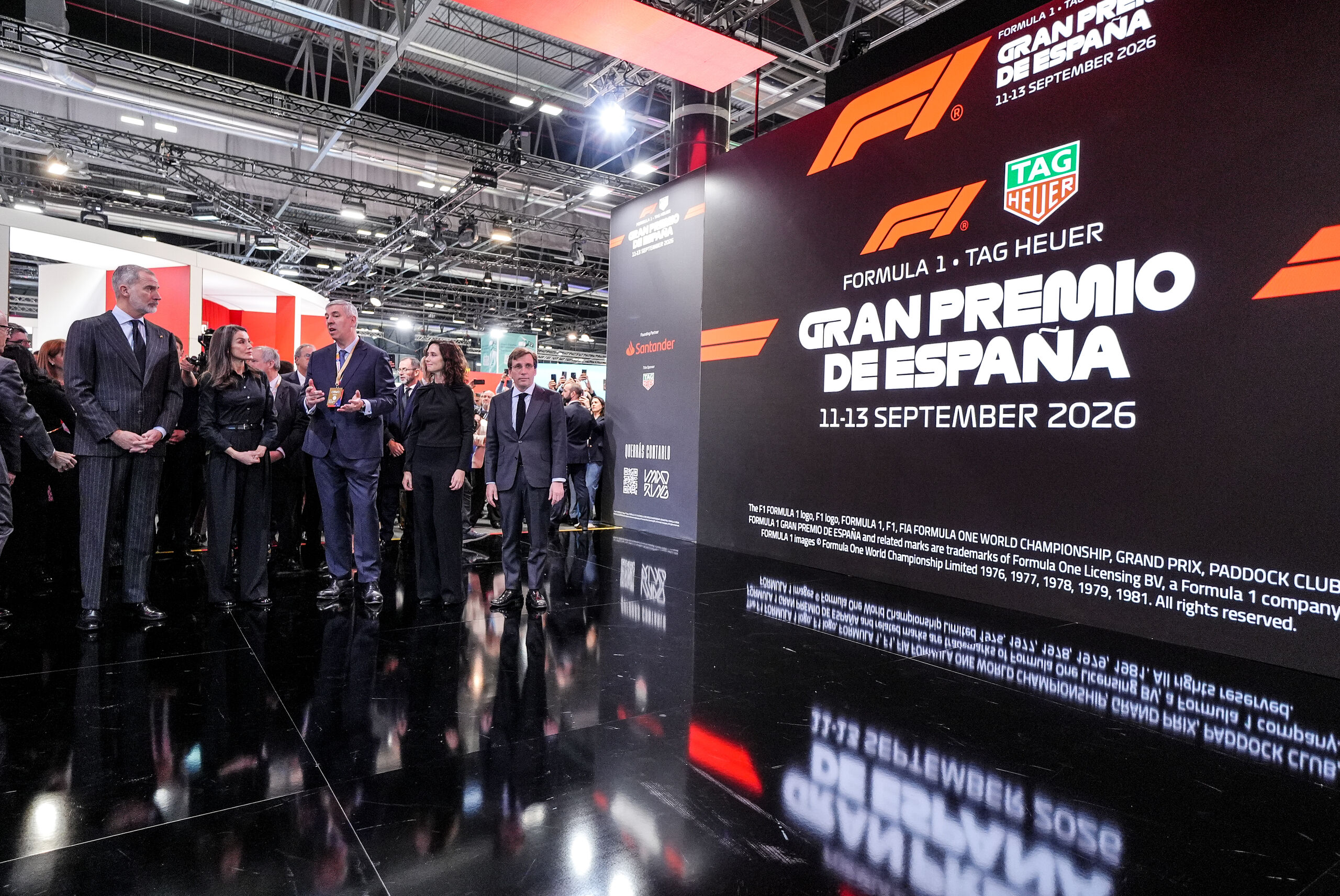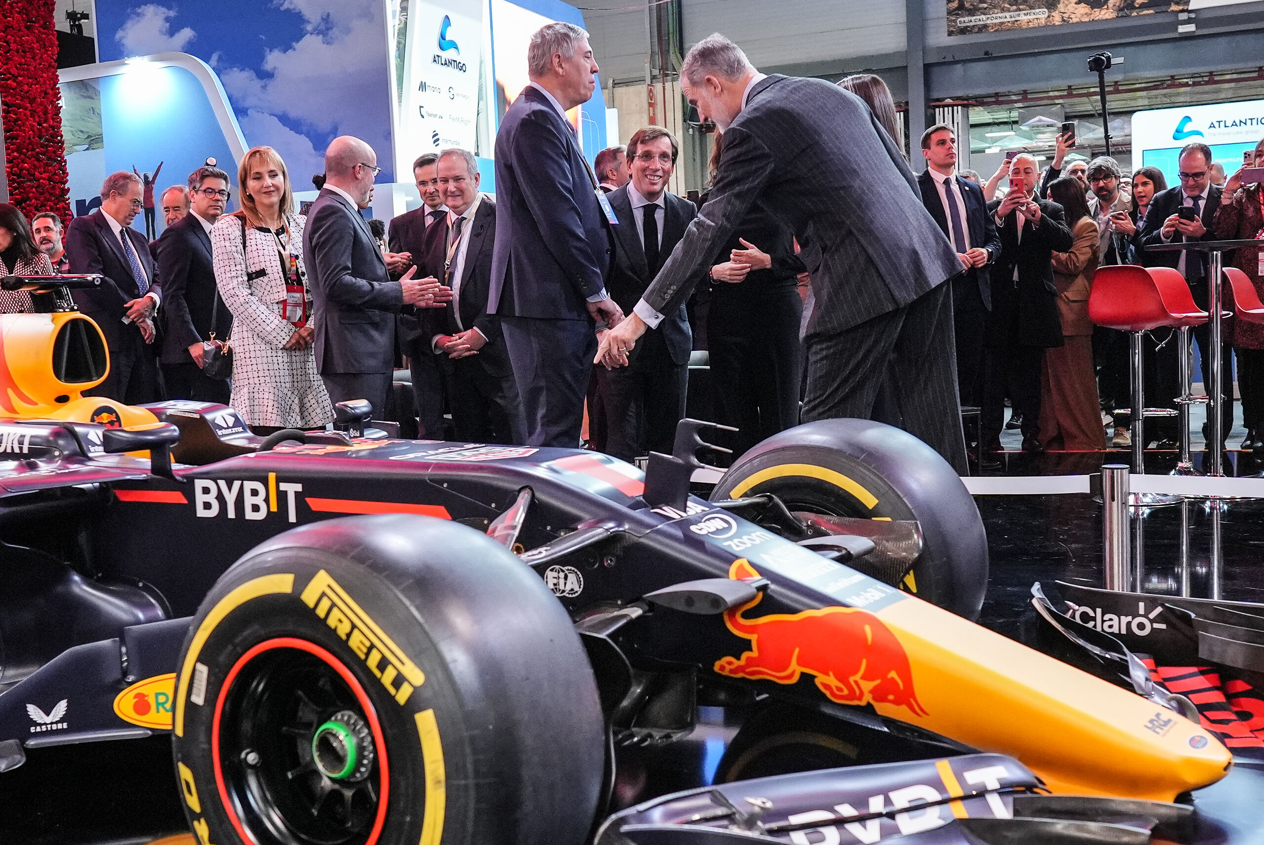 Felipe VI señala uno de los coches expuestos en IFEMA como muestra de los preparativos del Gran Premio de Fórmula 1, que tendrá lugar en la capital el próximo mes de septiembre.