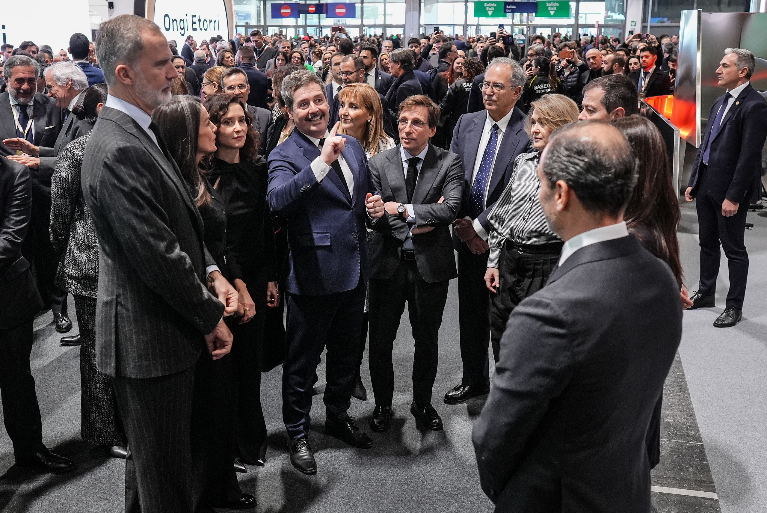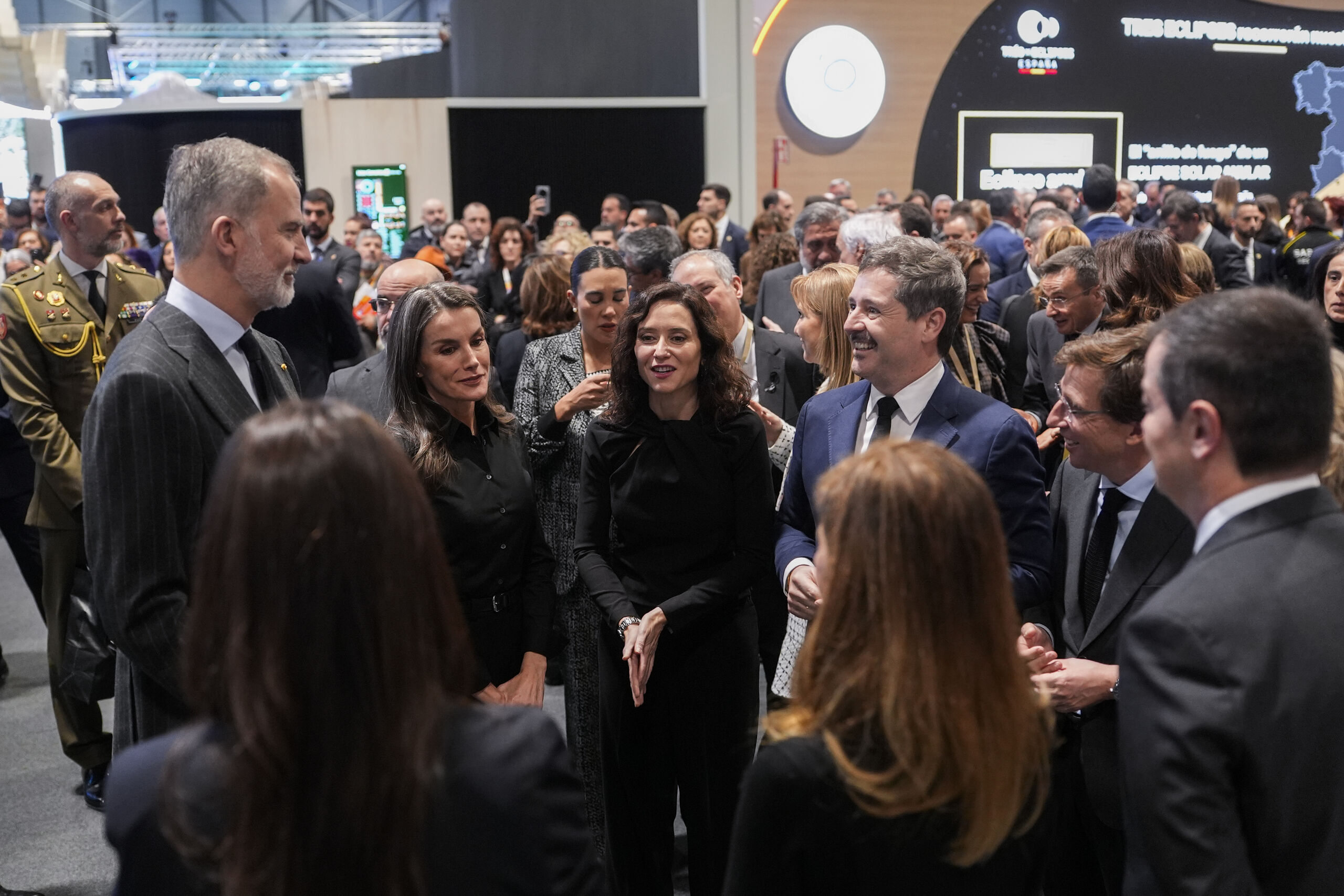 Felipe VI saluda al alcalde de Madrid, José Luis Martínez-Almeida, durante la inauguración oficial de la 46ª edición de FITUR, en IFEMA Madrid. A la izquierda, Doña Letizia saluda a Ayuso.