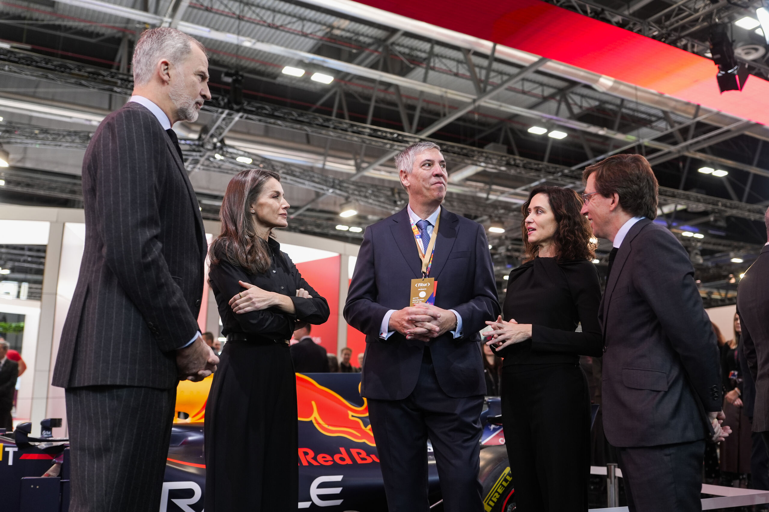 Los Reyes Felipe VI y Letizia; el presidente del Comité Ejecutivo de Ifema Madrid, José Vicente de los Mozos; la presidenta de la Comunidad de Madrid, Isabel Díaz Ayuso, y el alcalde de Madrid, José Luis Martínez-Almeida, charlan durante la inauguración oficial de la 46ª edición de FITUR, en IFEMA Madrid.