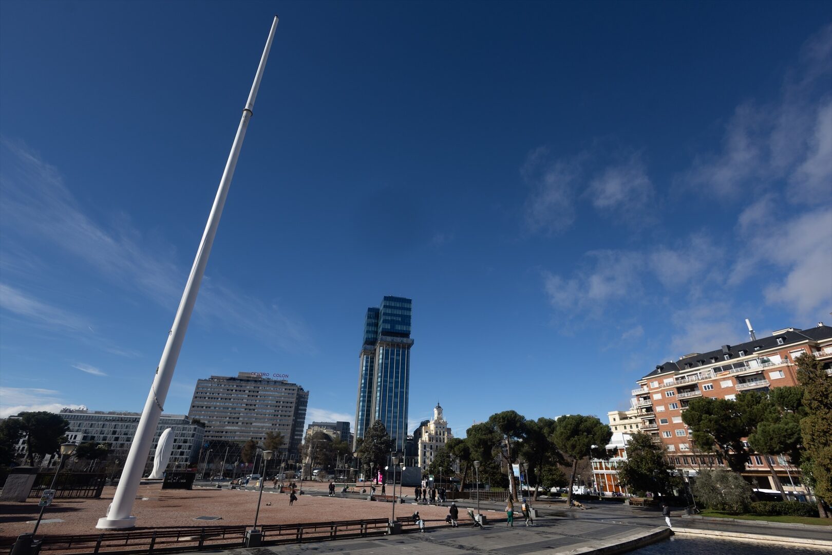 La gran bandera nacional que preside la plaza de Colón en Madrid no volverá a izarse, por el momento. La decisión responde a una cuestión de prudencia ante los continuos episodios de fuertes rachas de aire que han azotado la capital durante las últimas semanas.