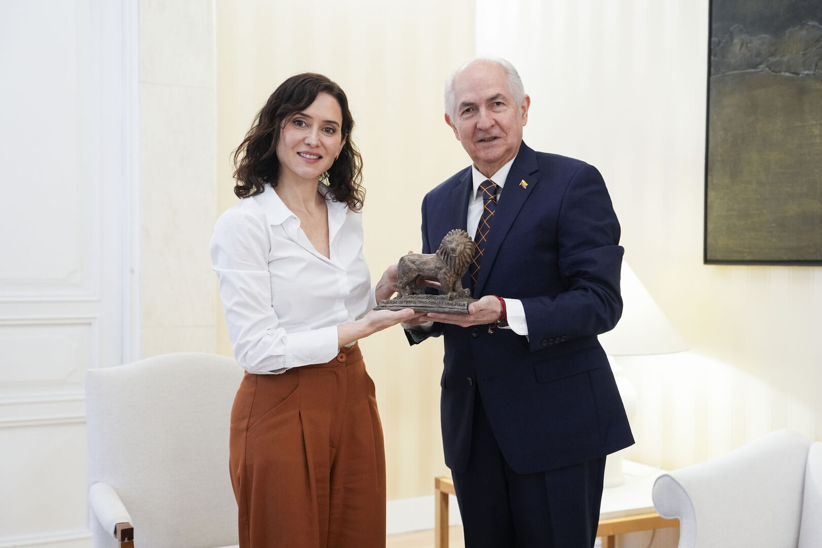 Ledezma ha destacado el "firme compromiso con la libertad y la causa democrática de Venezuela" que, a su juicio, ha mantenido la presidenta madrileña en los últimos años. Durante el encuentro, celebrado en la sede del Ejecutivo autonómico, el exregidor caraqueño ha hecho entrega a Díaz Ayuso de una escultura del León de Caracas, símbolo histórico de la capital venezolana que se remonta a su fundación en 1567.