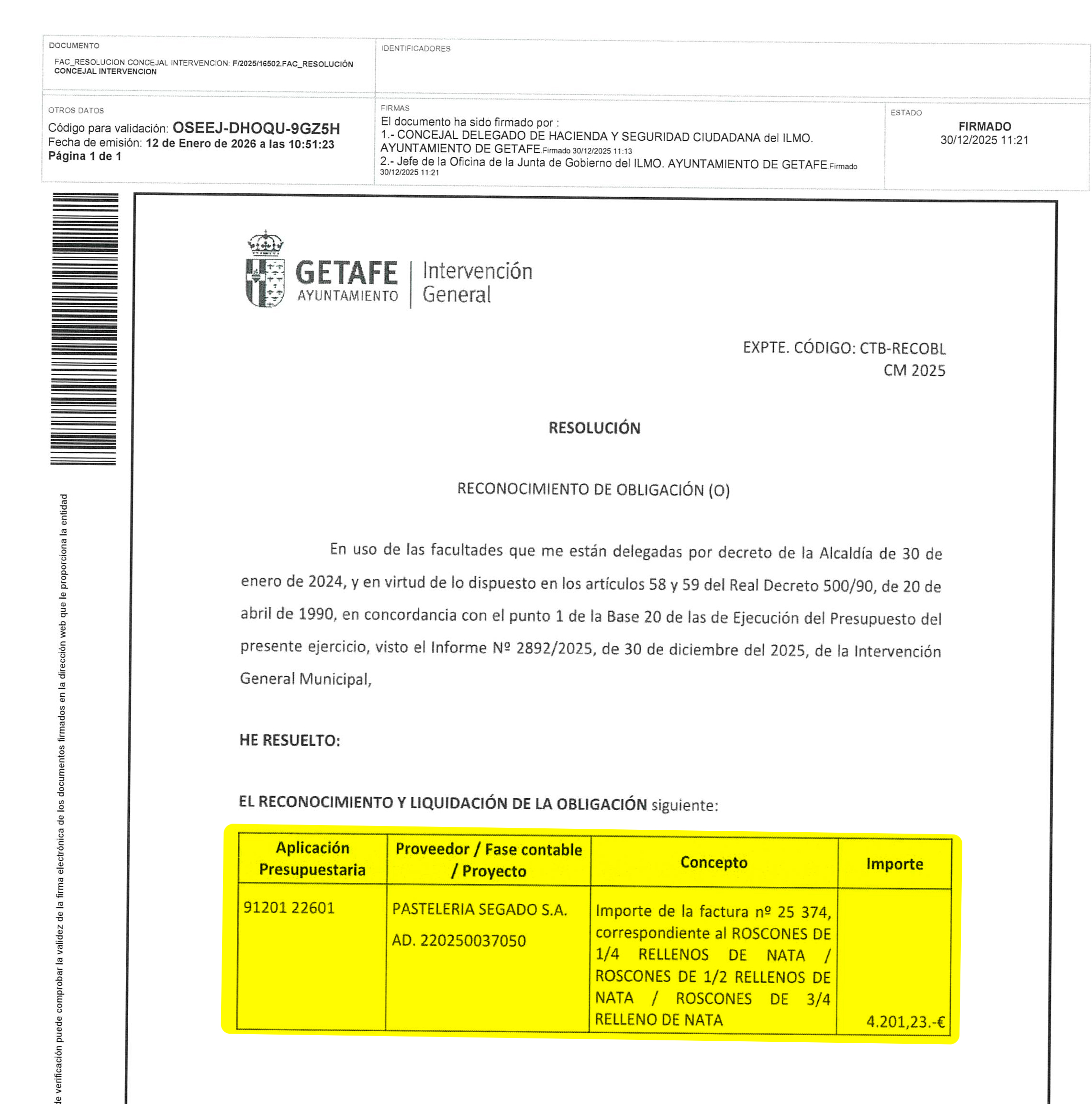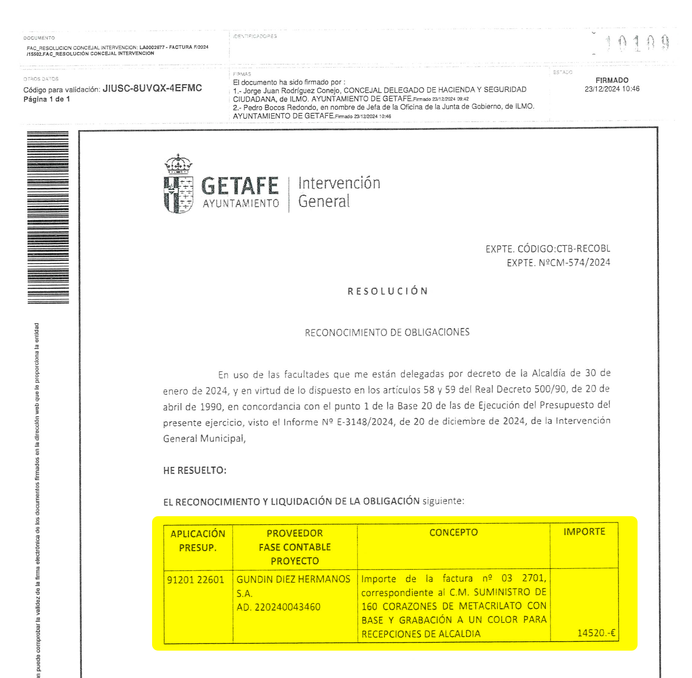 Según la relación de gastos facilitada por el Partido Popular de Getafe, el Ayuntamiento ha destinado diversas partidas a labores de protocolo y representación. Entre los documentos presentados, destaca un gasto de 14.520 euros en concepto de "corazones de metacrilato" destinados a las recepciones de la alcaldía.