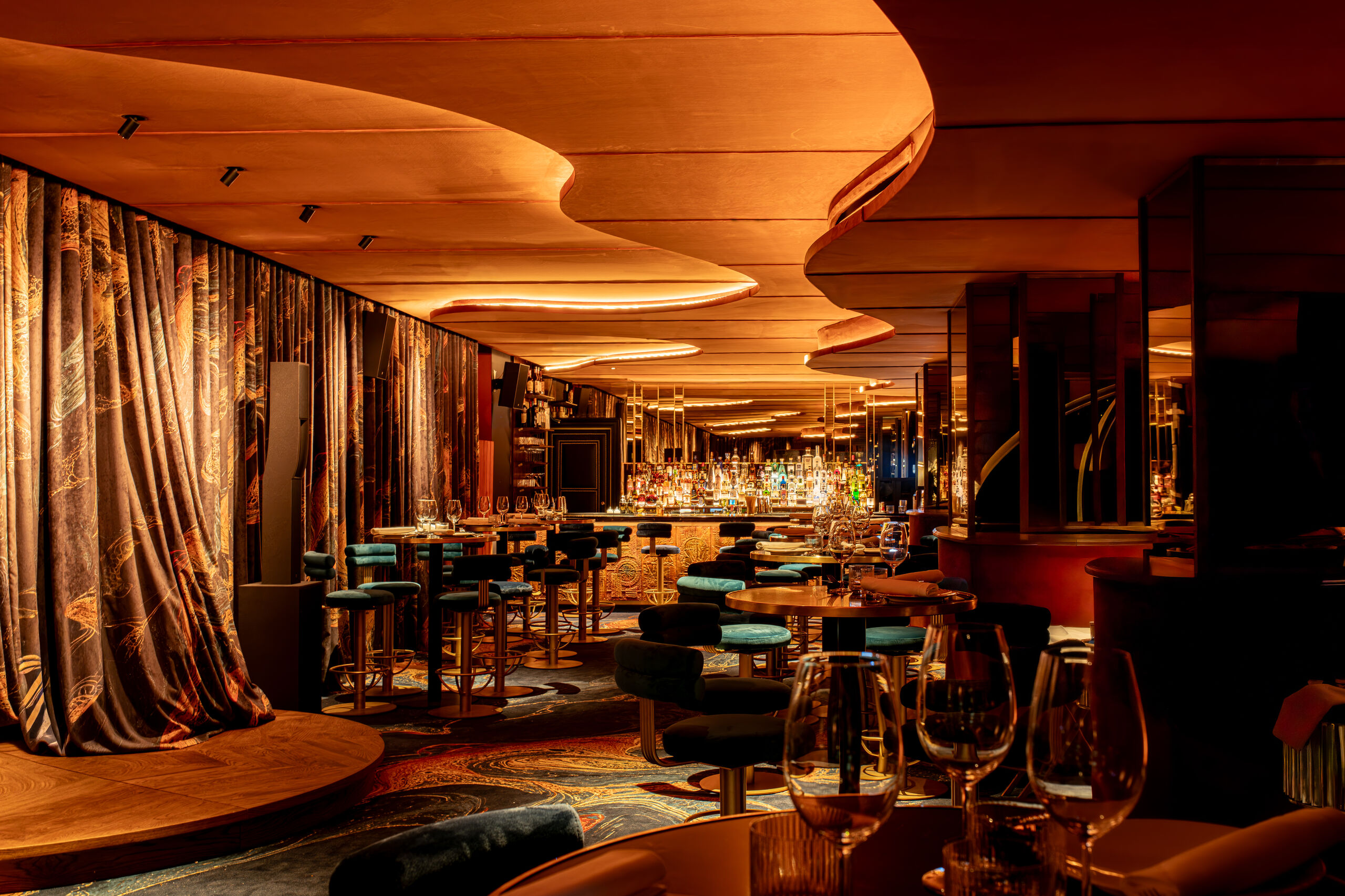 La planta subterránea, la primera abierta al público, es uno de los espacios más llamativos del club. Allí se encuentra el llamado Spa de Langostas, un espacio nocturno donde el marisco vivo es el protagonista gastronómico y que además incluye música, iluminación teatral y una pista de baile con DJ.