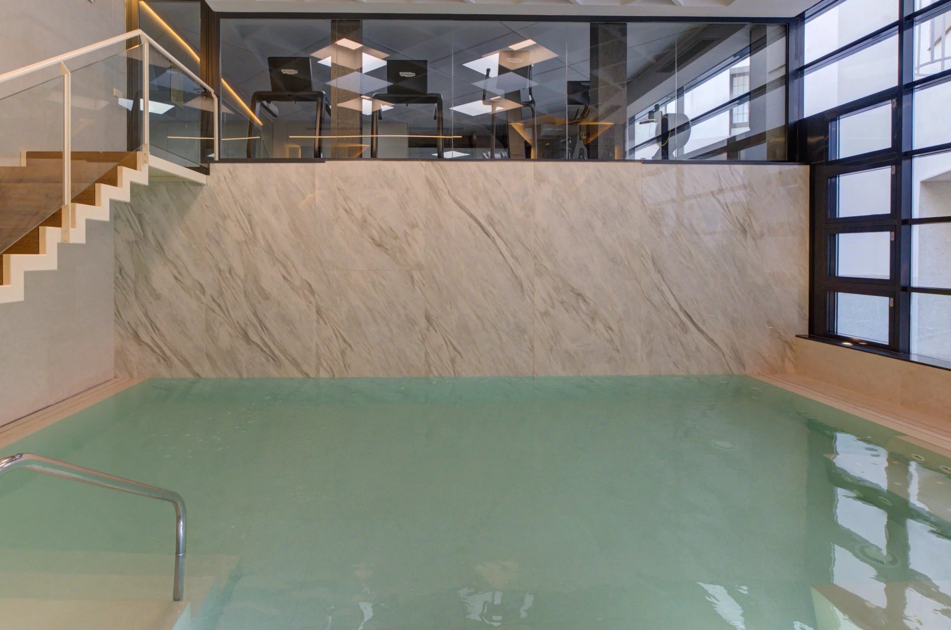 El edificio ofrece zonas comunes como piscina climatizada, gimnasio, sauna y sala de reuniones.