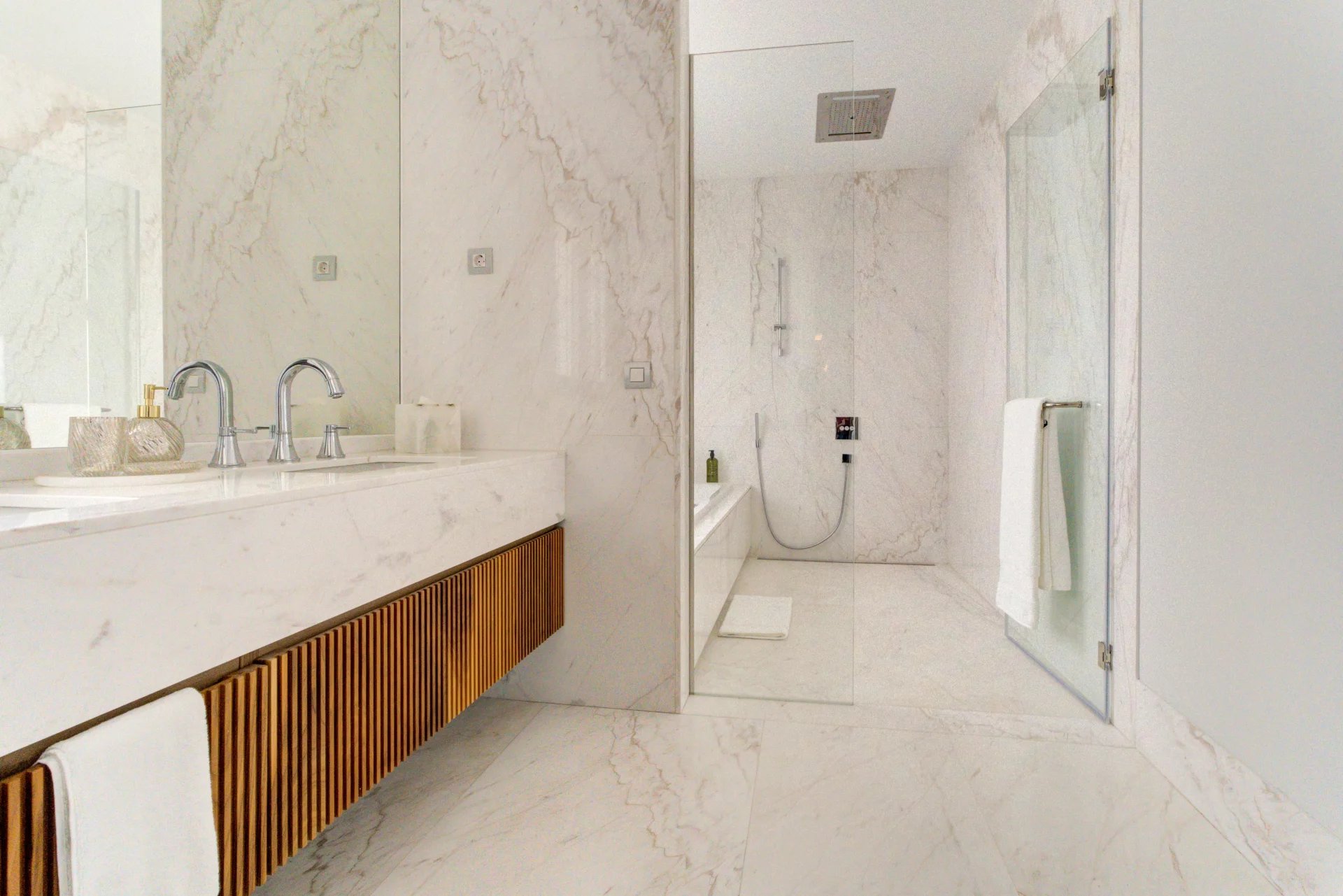 El baño de la suite principal cuenta con ducha y bañera. En total, el ático suma cuatro cuartos de baños más el de cortesía.