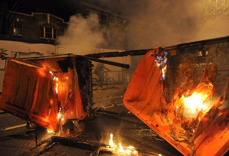 Los violentos, adolescentes en su mayoría según los medios británicos, se sirvieron también de cubos de basura para formar barricadas con ellos y dificultar el paso de los coches policiales a calles cuyos comercios saqueaban.