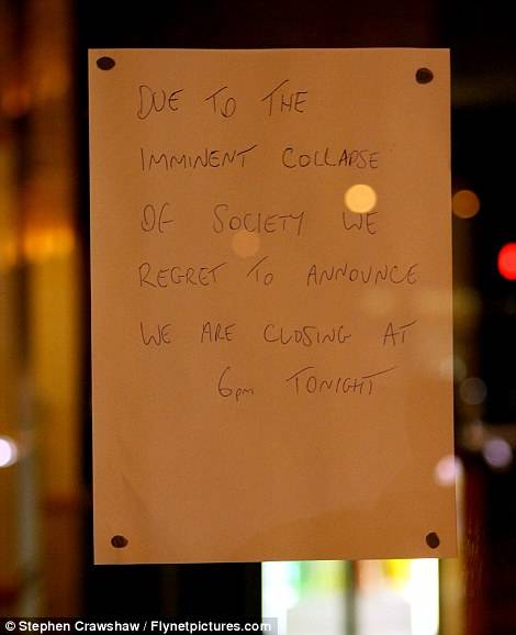 Pese al anuncio de Cameron, la pasada noche cerraron la mayoría de las tiendas y los bares de los barrios y zonas más afectadas por los disturbios, y muchas empresas enviaron a sus empleados más temprano a casa en una especie de toque de queda autoimpuesto. Lo mismo ocurría con el ocio: algunos de los teatros de la capital británica cancelaron sus funciones por miedo. Un cartel colgado en un comercio inglés y publicado por el diario Daily Mail resume cuál es la situación que se está viviendo: "Ante el inminente derrumbe de la sociedad, lamentamos anunciar que cerramos esta noche a las 6".