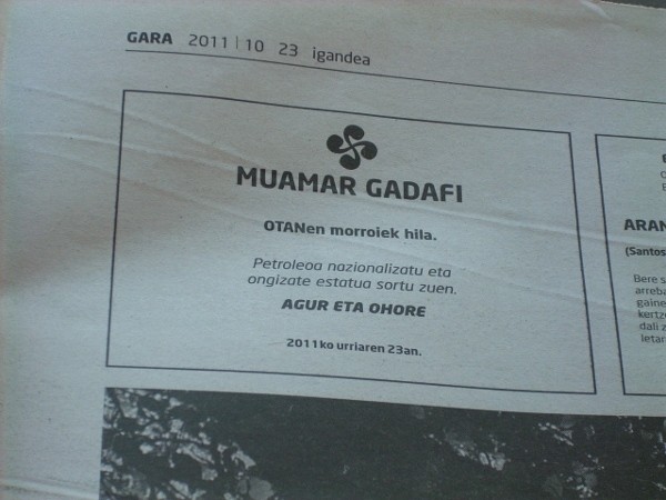 El diario Gara publica este domingo una esquela del dictador Muamar Gadafi, muerto este mismo jueves en Sirte. La desconcertante imagen la ha captado un internauta en su blog, y ya está corriendo como la pólvora en las redes sociales.