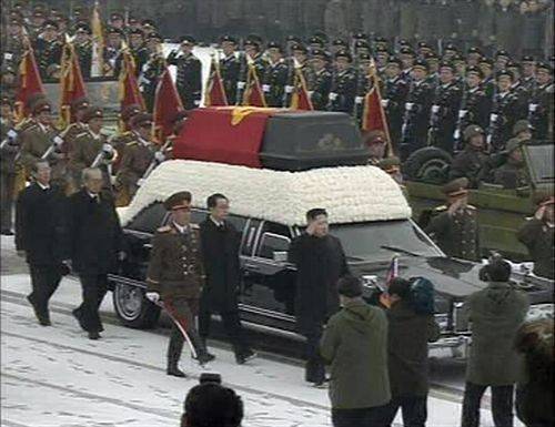 El sucesor de Kim Jong Il, su hijo Kim Jong Un, camina delante del coche fúnebre, al que siguen numerosos representantes de la élite política y militar de Corea del Norte, con una ciudad completamente nevada como escenario. El cortejo fúnebre realizará una ruta de 40 kilómetros por Pyongyang, donde aguardan cientos de miles de norcoreanos, a pesar de las bajas temperaturas invernales, para despedir al 'Querido Líder'.