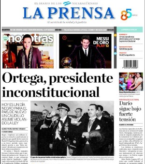 Además, el diario apuntaba que "hoy es un día negro para el país, de nuevo un caudillo asume violando la ley". En su editorial hizo un repaso de la ley que impide la reelección y terminaba señalando que "Daniel Ortega se ha hecho reelegir de manera inconstitucional, fraudulenta y violenta" y apunta que se trata de un "ultraje" del que "son cómplices quienes, por el motivo que sea, han venido a avalar con su presencia la inauguración del nuevo período de Daniel Ortega, el cual es flagrantemente inconstitucional, ilegítimo y fraudulento".