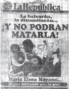 Nota del redactor: Aunque no suelo hacer esto, quiero comentar algo sobre esta nota y sobre María Elena Moyano. Aquel día apenas tenía 19 años y recuerdo claramente ese "paro armado" convocado por los terroristas de Sendero Luminoso. Recuerdo haber oído de las marchas contra el paro en algunas zonas pero sobre todo la convocada en Villa El Salvador. Este paro era como un episodio más de la locura terrorista que se unía a los coches-bomba, a los atentados, a las violentas ejecuciones en poblados de la Sierra, a los "toques de queda", o a los apagones casi interdiarios. Así de vergonzosa llegó a ser nuestra cotidianidad y ya nadie se sorprendía. Triste.