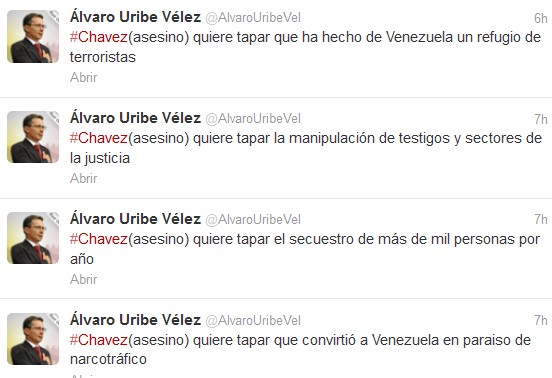 Ahora, pese a que hace buen tiempo está alejado de la actividad política, Uribe lanzó este domingo duros ataques contra Hugo Chávez. A través de su perfil en Twitter, Uribe señaló que "#Chavez(asesino) quiere tapar el impune asesinato de 19 mil venezonanos (sic) por año" y en otro mensaje que "#Chavez(asesino) quiere tapar que en entre 1998 y 2011 los homicidios pasaron de algo más de 4.000 a casi 19.000 por año". En mensajes posteriores, Uribe agregó que "#Chavez(asesino) quiere tapar la manipulación de testigos y sectores de la justicia"; "el secuestro de más de mil personas por año" y "que ha hecho de Venezuela un refugio de terroristas".