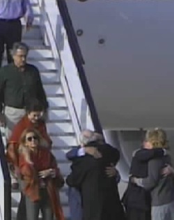 LD (Agencias) Al pie de la escalerilla del avión, el ministro de Asuntos Exteriores, Miguel Ángel Moratinos, y Esperanza Aguirre, han recibido a los españoles, entre los que se encontraban los miembros de la delegación de la Comunidad de Madrid que no pudieron abandonar anteayer Bombay.