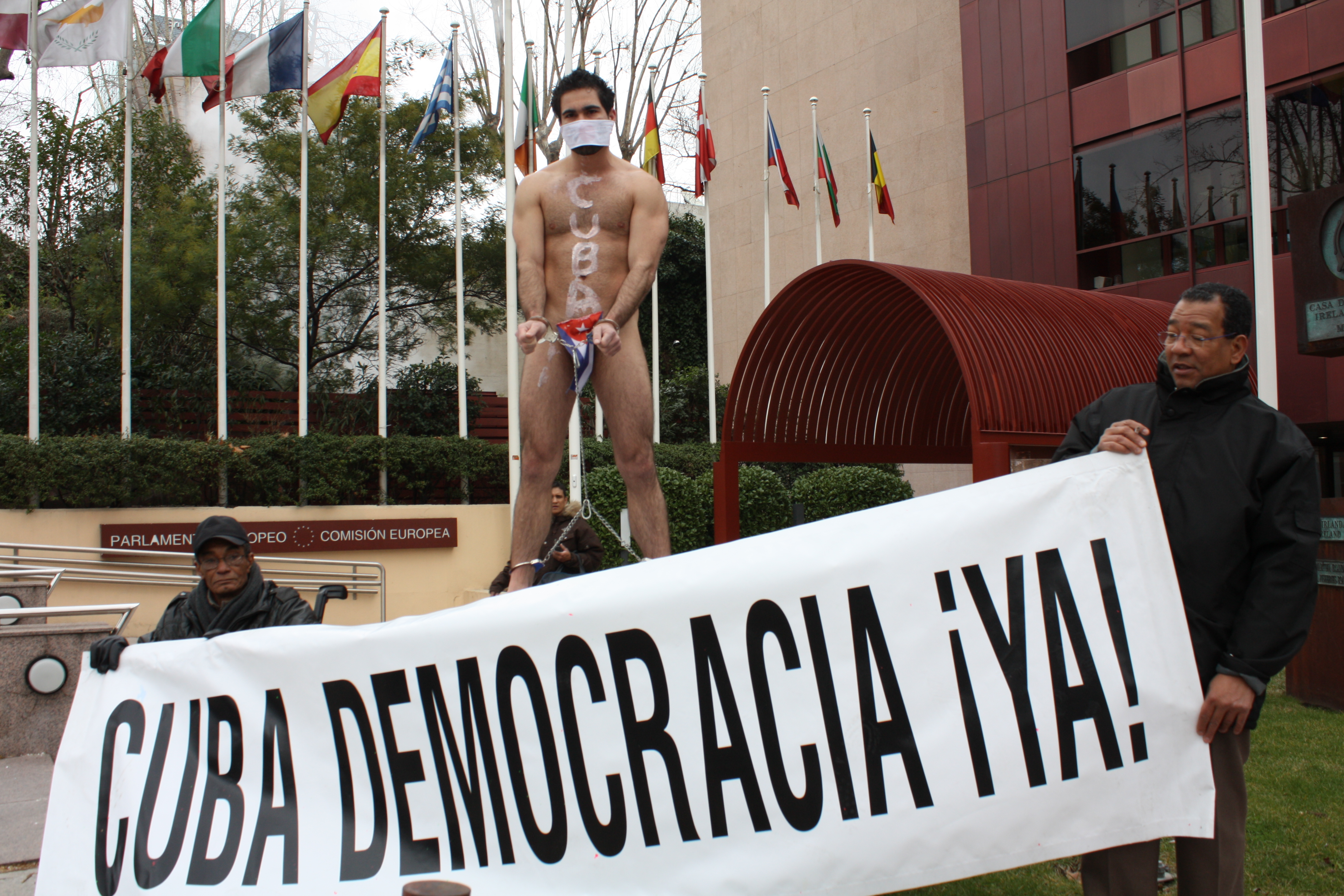 Con las manos y los pies atados por la bandera cubana, y desnudo "porque así es como se siente toda la nación cubana" se ha manifestado por toda la Castellana uno de los integrantes de la asociación. Sobre una pancarta con el lema: "Cuba, Democracia Ya" han denunciado la "humillación" a la que se sienten sometidos por parte del Gobierno de España. Su portavoz, Rigoberto Carceller ha asgurado a Libertad Digital que "No podemos tolerar esta cortina de humo, esta pantomima del Gobierno de España y la dictadura cubana" asegura.