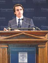 Bajo el título de "Siete teorías del terrorismo actual", Aznar pronunció su primera conferencia ante varios cientos de personas, en su mayoría estudiantes, que prácticamente llenaron el Gaston Hall del centro universitario. Además, presentes estaban un nutrido grupo de diplomáticos y el presidente del FMI, Rodrigo Rato. Lo hizo en inglés advirtiendo a toda su audiencia, que si Arnold Schwarzenegger llegó a gobernador de California con su peculiar acento en inglés, "pienso que hay esperanza para mí".