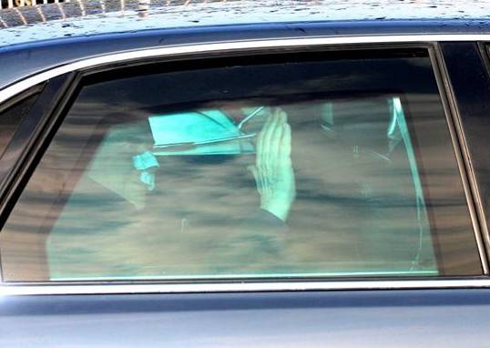 El jefe de Gobierno prefirió no salir del coche, pero el vehículo en el que viajaba circuló muy despacio ante los periodistas para permitirle saludar con la mano. Berlusconi llevaba una vistosa venda que le cubría la nariz.