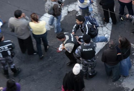 Mientras tanto, simpatizantes del presidente Correa intentaron romper el cordón policial que custodiaba el hospital para "rescatarlo", tal y como exhortó a la población el ministro de Exteriores, Ricardo Patiño, desde el balcón del Palacio de Gobierno en el centro de Quito. Las fuerzas de seguridad respondieron con gases lacrimógenos contra estos manifestantes. El propio canciller fue agredido por un grupo de policías cuando se desplazó hasta el hospital.