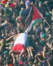 Formando una cadena humana, los agentes empujaban poco a poco y con mucho trabajo a las miles de personas para apartarlos, por lo menos, de la parte oriental del recinto. El ataúd fue colocado encima de un vehículo, que pudo avanzar sólo unos metros. Los restos fueron literalmente "secuestrados" de manos de los agentes de seguridad que lo custodiaban y llevados hasta su lugar de reposo. La ceremonia tuvo que acelerarse, y se procedió de inmediato a enterrar el cadáver del rais. Los altavoces anunciaron la inhumación y la multitud comenzó a rezar, acompañada por los dirigentes palestinos. Las calles colindantes aún permanecen repletas de gente que canta alabanzas y lemas.En la Explanada de las Mezquitas, en la ciudad vieja de Jerusalén, unos 15.000 palestinos mayores de 45 años participaron en los tradicionales rezos del último viernes de Ramadán, que estuvieron dedicados a la memoria de Arafat. Cientos de jóvenes permanecían en los alrededores y trataban de entrar por la fuerza. Muchos de ellos tiraron piedras a los agentes israelíes y se lanzaron en avalancha sobre varios accesos, en particular sobre la puerta de Damasco.