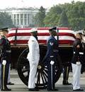 Unas horas antes, en la Catedral Nacional de Washington, donde se celebró el funeral de Estado, se dieron cita los cuatro ex presidentes vivos de EEUU y sus esposas -Bill y Hillary Clinton, George y Barbara Bush, Jimmy y Rosalyn Carter, y Betty y Gerald Ford-, así como algunos de los grandes amigos de Reagan y representantes de los Gobiernos de numerosos países. Entre ellos, el príncipe Carlos de Inglaterra; la primera dama de México, Marta Sahagún; Caroline Kennedy, la única superviviente de la familia directa del ex presidente John F. Kennedy, y el ex primer ministro canadiense Brian Mulroney. Junto a Thatcher se sentó Mijail Gorbachov, quien asistió emocionado al funeral del que fuera en algún tiempo su rival y finalmente su amigo.