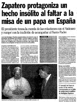 En España aún se recuerda como decidió no acudir a la misa que ofició en España Benedicto XVI durante su visita a Valencia en 2006, a pesar de que todos los presidentes del Gobierno españoles siempre habían acudido a los principales actos presididos por los Pontífices, sin olvidar que éste también es Jefe de Estado.