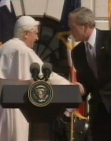El presidente de Estados Unidos, George W. Bush, por su parte, le dio la bienvenida: "Nuestra nación le da la bienvenida y valoramos su ejemplo", dijo antes de reunirse en privado con la máxima autoridad del Estado Vaticano en el Despacho Oval.