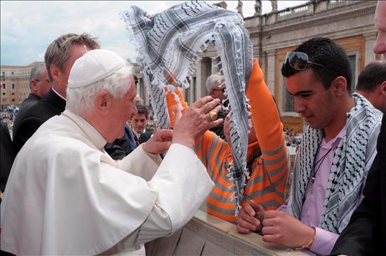 El Papa prosiguió hablando con ellos. Poco después, su secretario particular, Georg Gaenswein, le retiró la "kefía" de la espalda. Benedicto XVI viajará a Tierra Santa del 8 al 15 de mayo próximo y visitará, entre otros, Belén y un campo de refugiados palestinos cercano a la ciudad.