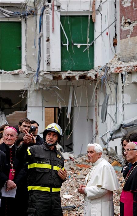 Desde Onna se trasladó a L'Aquila, donde visitó la basílica de Santa María di Collemaggio y la Casa del Estudiante, otros dos símbolos del terremoto.