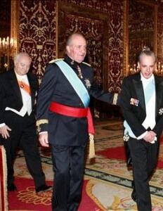 Don Juan Carlos recibió al embajador en la Cámara Oficial del Palacio Real, acompañado de Moratinos, el jefe de la Casa del Rey, Alberto Aza, el secretario de la Casa, Ricardo Díez Hochleitner, y el jefe del Cuarto Militar, teniente general Carlos Victoria de Ayala.