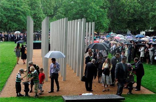 El complejo está formado por 52 columnas de acero, cada una con un acabado diferente para simbolizar la singularidad de cada uno de los fallecidos y con la fecha, hora y localización del ataque que representan: las paradas de metro de Russell Square, Aldgate y Edgware Road, la de bus de Tavistock Square y la estación de King's Cross. Las figuras están agrupadas para representar los espacios en los que se produjo un ataque en cadena que dejó como área más afectada la estación, de la que partieron los cuatro suicidas y que sumó la mitad de los muertos.