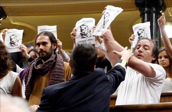 Cerca de una veintena de personas aprovecharon la primera jornada de Puertas Abiertas en el Congreso para exhibir en el hemiciclo pancartas en favor de la activista saharaui Aminatu Haidar, que este lunes cumple veintidós días en huelga de hambre. Este gesto les costó la expulsión del Salón de Plenos.