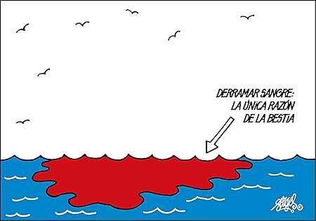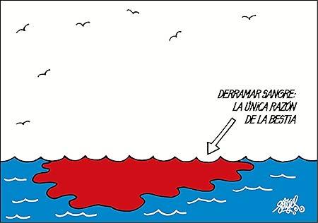 No llega a citarlo, pero en un día en la que prácticamente todas las páginas webs informativas hablan de lo ocurrido con la flotilla "solidaria" de Gaza a nadie escapa que esa bestia es Israel , cuya única razón de existir sería, según Forges, el derramamiento de sangre.