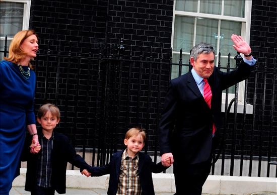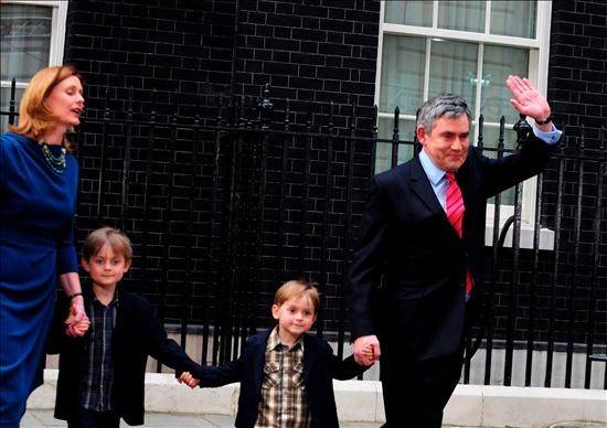 Brown se dirigió al palacio con su esposa Sarah y sus dos hijos, John y Fraser, tras anunciar oficialmente su renuncia a la puertas de Downing Street, la que ha sido su residencia oficial durante los últimos 13 años, primero como ministro de economía y después como primer ministro.