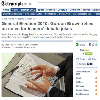 Una semana después, una fotografía indiscreta vuelve a alimentar la polémica. Desvelada por Daily Telegraph, la instantánea retrata las manos de Brown durante el debate, bajo las que se pueden leer las notas que había tomado para su intervención.