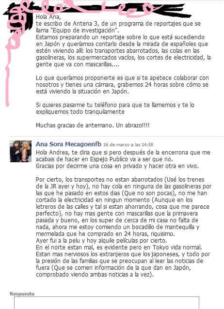 Uno de estos casos lo ha denunciado a través de su perfil de Twitter una de las españolas que reside en el país nipón, y que reproduce con una foto subida a su Twitpic la conversación mantenida en el muro de su Facebook con una redactora de un programa de televisión.