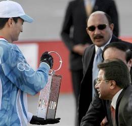 La llama llegó en un avión fletado desde Muscat a la base aérea cercana a la ciudad de Rawalpindi, donde ocurrió el magnicidio de Benazir Bhutto el pasado mes de diciembre. Horas más tardes un acto oficial en Islamabad ha dado por primera vez en la Historia la bienvenida de la comitiva olímpica.