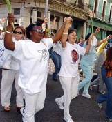 L D (EFE) Las Damas de Blanco desarrollaron este martes su cuarta y última jornada de actividades para conmemorar otro aniversario de las detenciones de 75 disidentes, ocurridas en la primavera del 2003. Vestidas de blanco y portando gladiolos, alrededor de 30 mujeres familiares de opositores presos caminaron en silencio por el céntrico barrio de El Vedado hasta la sede de la Dirección Nacional de Prisiones, dependiente del Ministerio del Interior de la dictadura, donde soltaron palomas, lanzaron gritos de "libertad, libertad" y pidieron una vez más la excarcelación de los opositores presos.