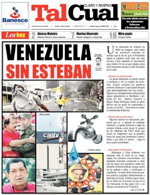 Tal Cual muestra en su portada una secuencia de imágenes comentadas por el humorista en el que se analizan cómo sería Venezuela tras la caída de Hugo Chávez, al que llama Esteban.