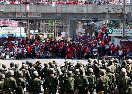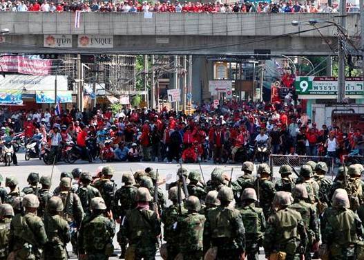 A lo largo del día, los soldados abrieron fuego en repetidas ocasiones para disolver a los grupos de manifestantes que reaparecían en varias zonas de la capital tailandesa, alentados por la última consigna del ex primer ministro Thaksin Shinawatra, su líder y quien la noche anterior, desde el exilio, llamó a los suyos a hacer la revolución.